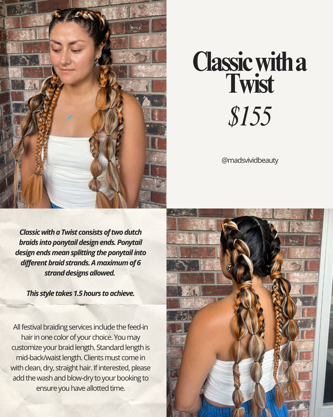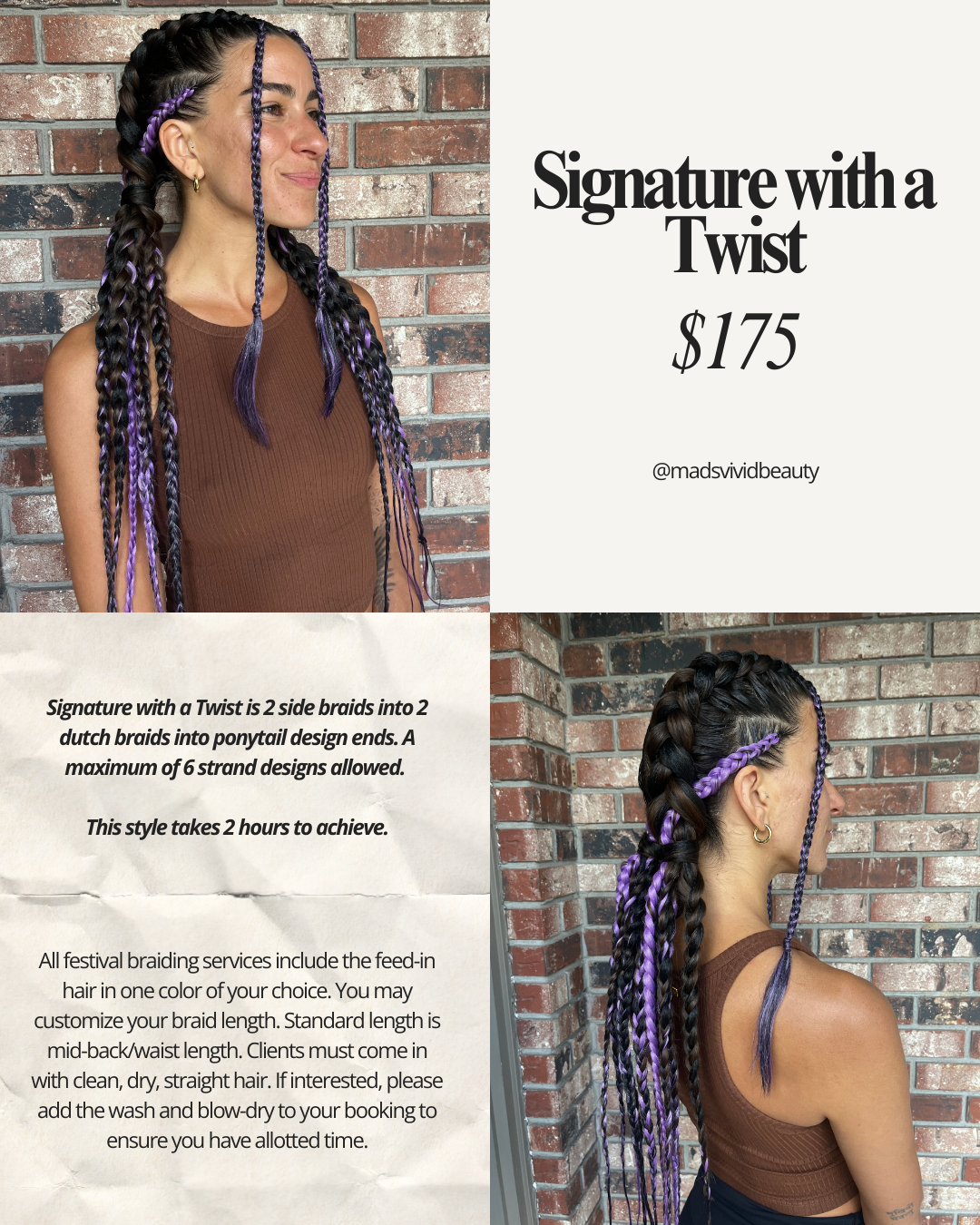 Get ready to turn heads with Festival Braids! Ideal for burning man, music festivals, sporting tournaments, feed in braids are designed to last and keep your hair protected for days. I’ve became experienced to offer detailed and stylish designs, including vibrant, colorful extensions. Book your appointment now and let us transform your hair into a work of art.